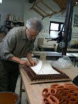 The final pieces are fairly rough, and use a single glaze. Although all of his sculptures are in a high fire clay, many of his newer works resemble other materials. Many pieces could be mistaken for metal, with a green patina, much like a weathered copper roof.